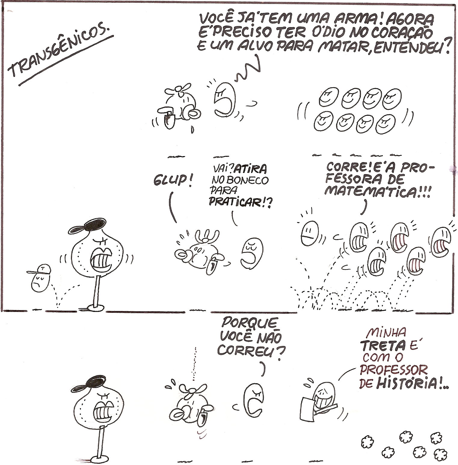 Os trangênicos surgiram nas paginas do jornal de jundiaí, onde trabalhei por muios anos. A urgência na entrega de material para a página foram exigindo mais ritimo nos desenhos. E DEU CERTO! Eram apenas bolinhas que interagiam com os acontecimentos de um país tipo- exportação. Por falta de tempo